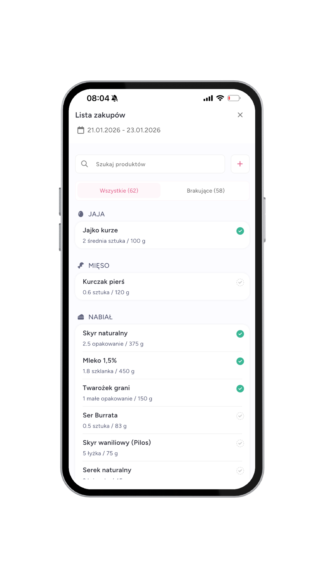 Od teraz zakupy będą jeszcze łatwiejsze! Lista zakupów w aplikacji pozwala na wygodne zaplanowanie co już masz w domu, a co potrzebujesz dokupić. Koniec przypadkowych zakupów i straconych pieniędzy!